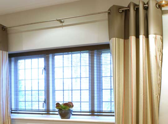 Faux leather to top and base of these eyelet curtains. Novatec wood Venetian blind.