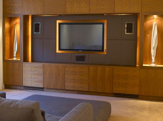 This media room boasts state of the art equipment with beautiful housing in American walnut and leather panelling.