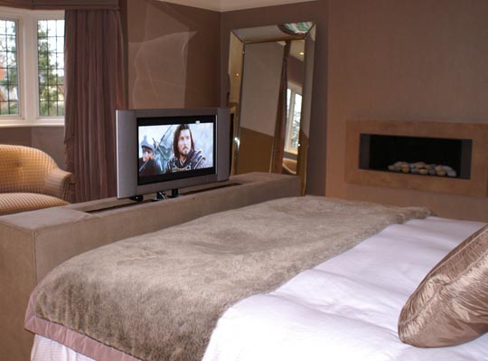Bespoke ottoman housing DVD player and LCD TV system raised remotely by lift.